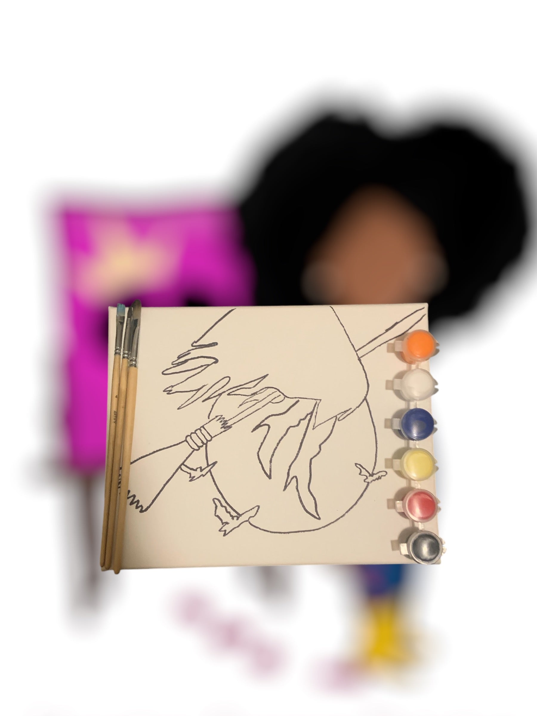All paint set includes easel, pre-drawn canvas, paint, and paint brushes.