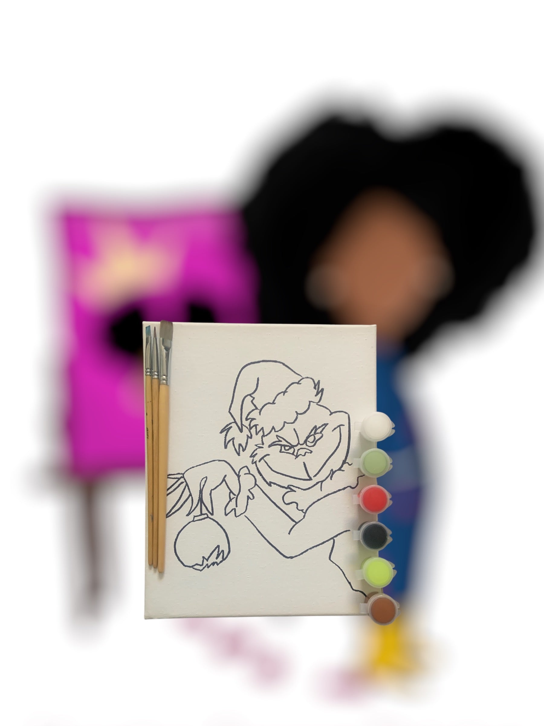 All paint set includes easel, pre-drawn canvas, paint, and paint brushes.