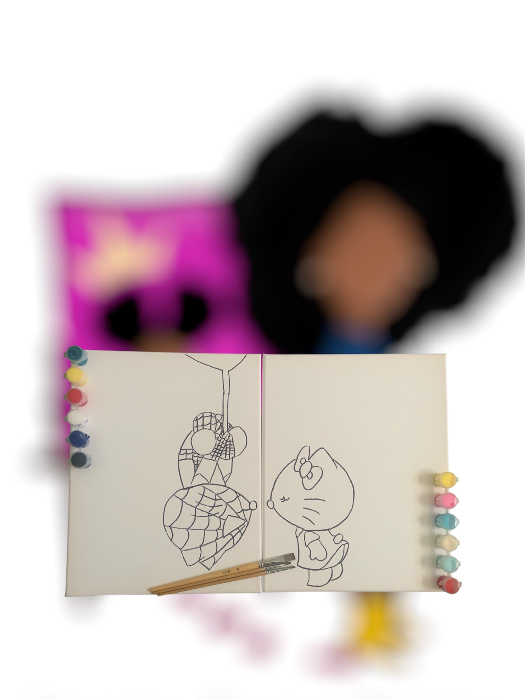 All paint set includes easel, pre-drawn canvas, paint, and paint brushes.