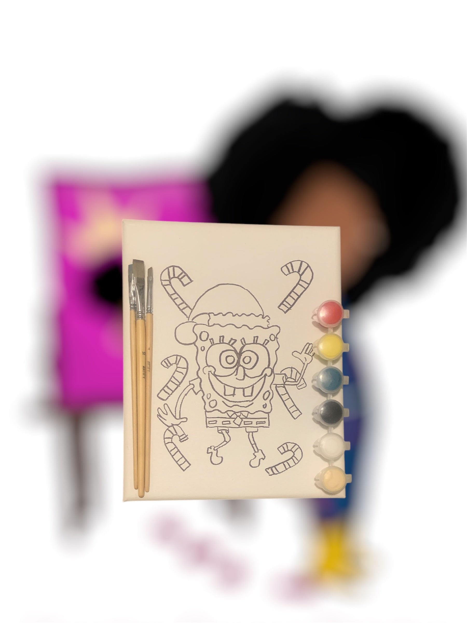 All paint set includes easel, pre-drawn canvas, paint, and paint brushes.